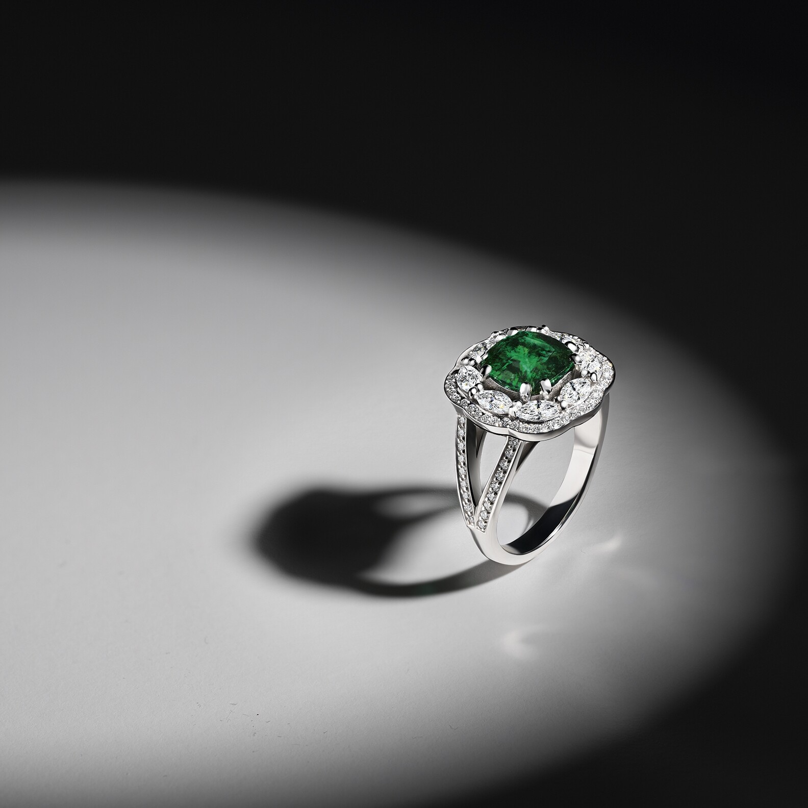 Prestige Bague B&F Prestige Renouveau en platine, or jaune, émeraude et diamants
